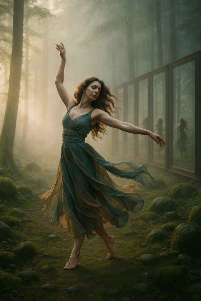 She dances through the silver mist,